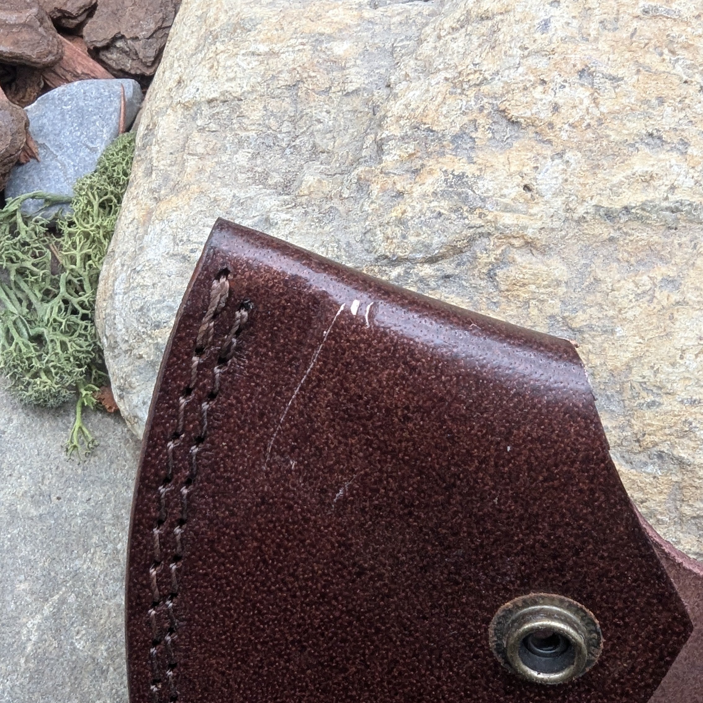 The shaft has been finished with our signature beeswax and linseed oil blend, which helps protect, aids in grip and brings out the wood's natural grain. Each axe is supplied with a hand-sewn leather sheath that connects with push buttons for quick and easy removal.