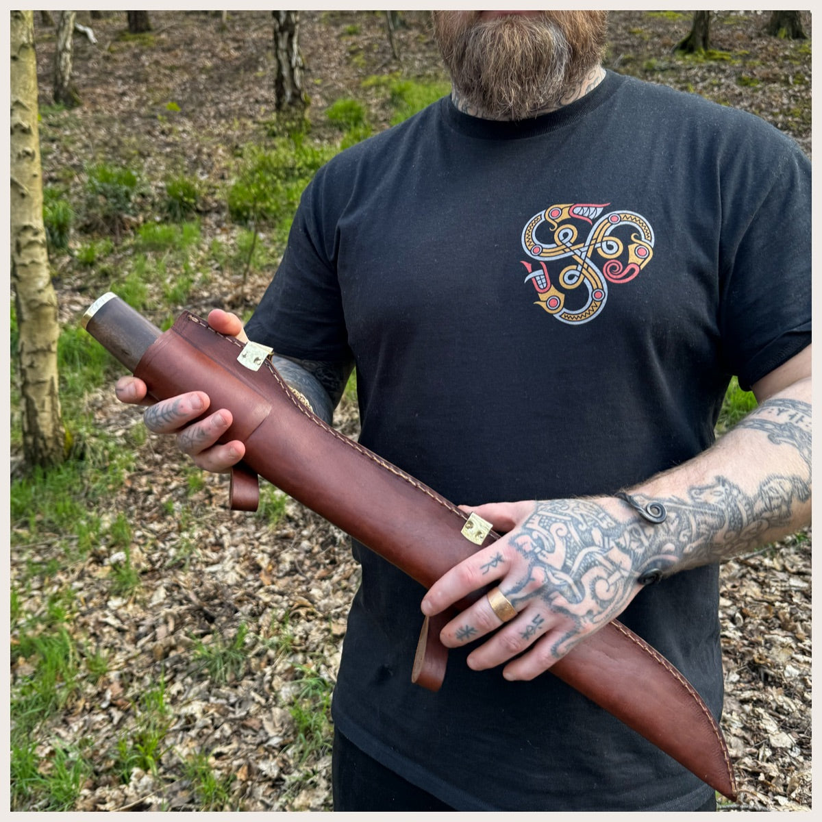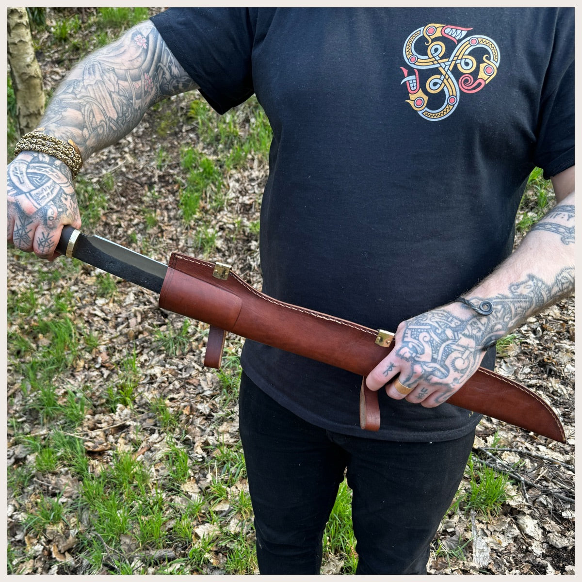 Each long-seax comes complete with a meticulously hand-sewn leather scabbard adorned with brass accents and double bolsters, showcasing exquisite craftsmanship and attention to detail.