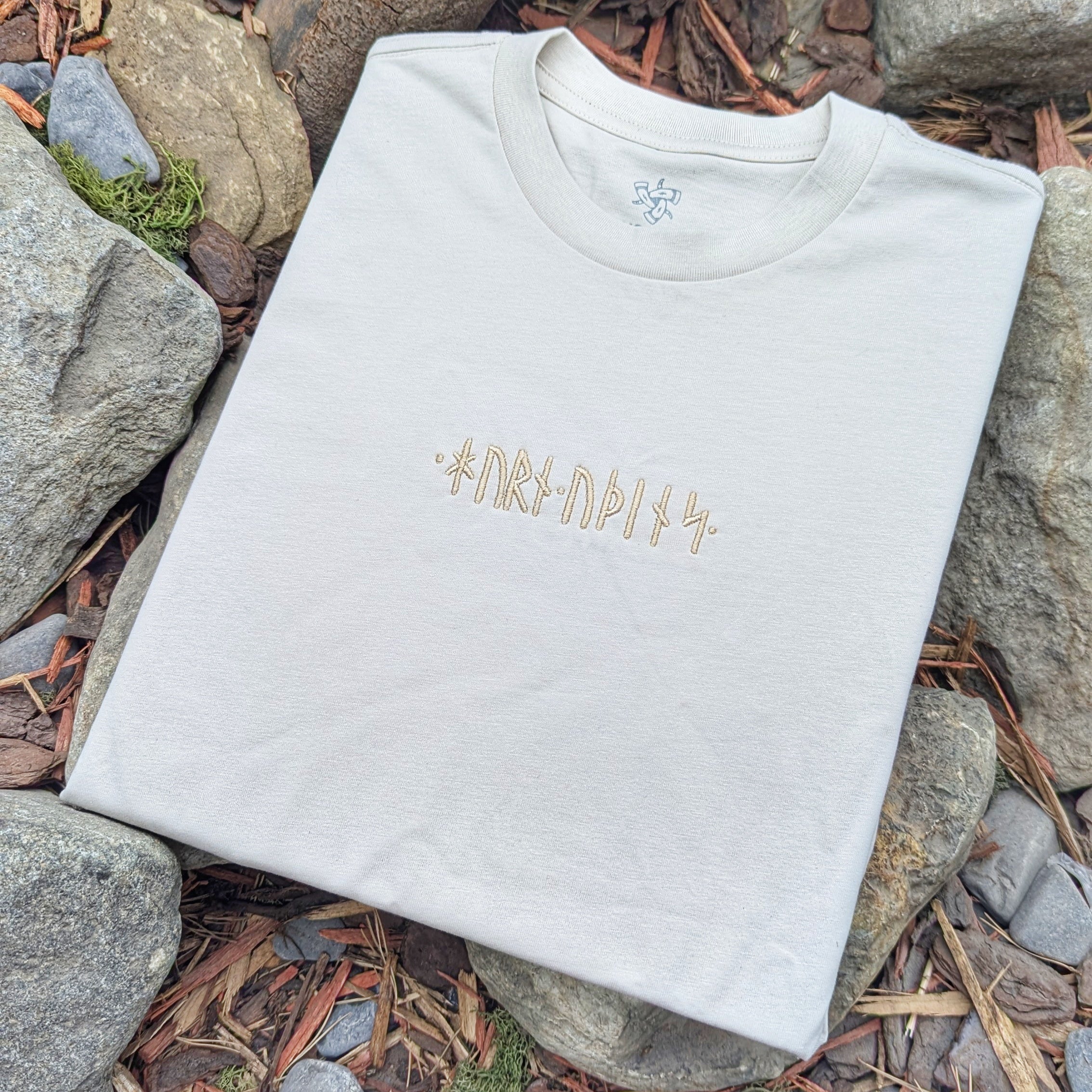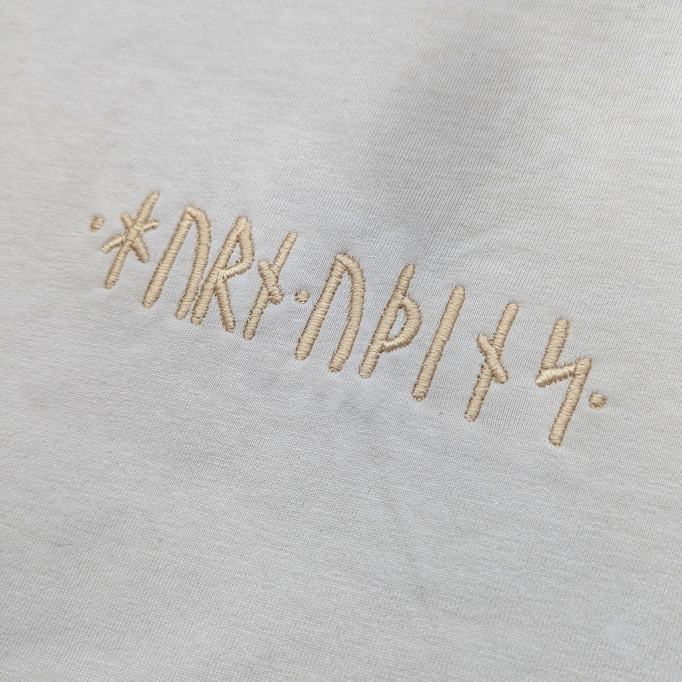 The Runic oversize tee in Bone is our oversized boxy men's t-shirt featuring "Horns of Odin" embroidered across the chest in Younger Futhark. Made from heavyweight 100% combed cotton, this tee has that ultra soft, smooth premium feel - and pre shrunk to ensure the right fit. Every time.