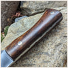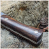 The handle has been hand-crafted from walnut wood with brass caps. The whole seax has been finished with our signature beeswax and linseed oil blend, which helps protect, aids in grip and brings out the wood's natural grain. The handmade scabbard has been hand-sewn and finished masterfully with brass accents and double bolsters.