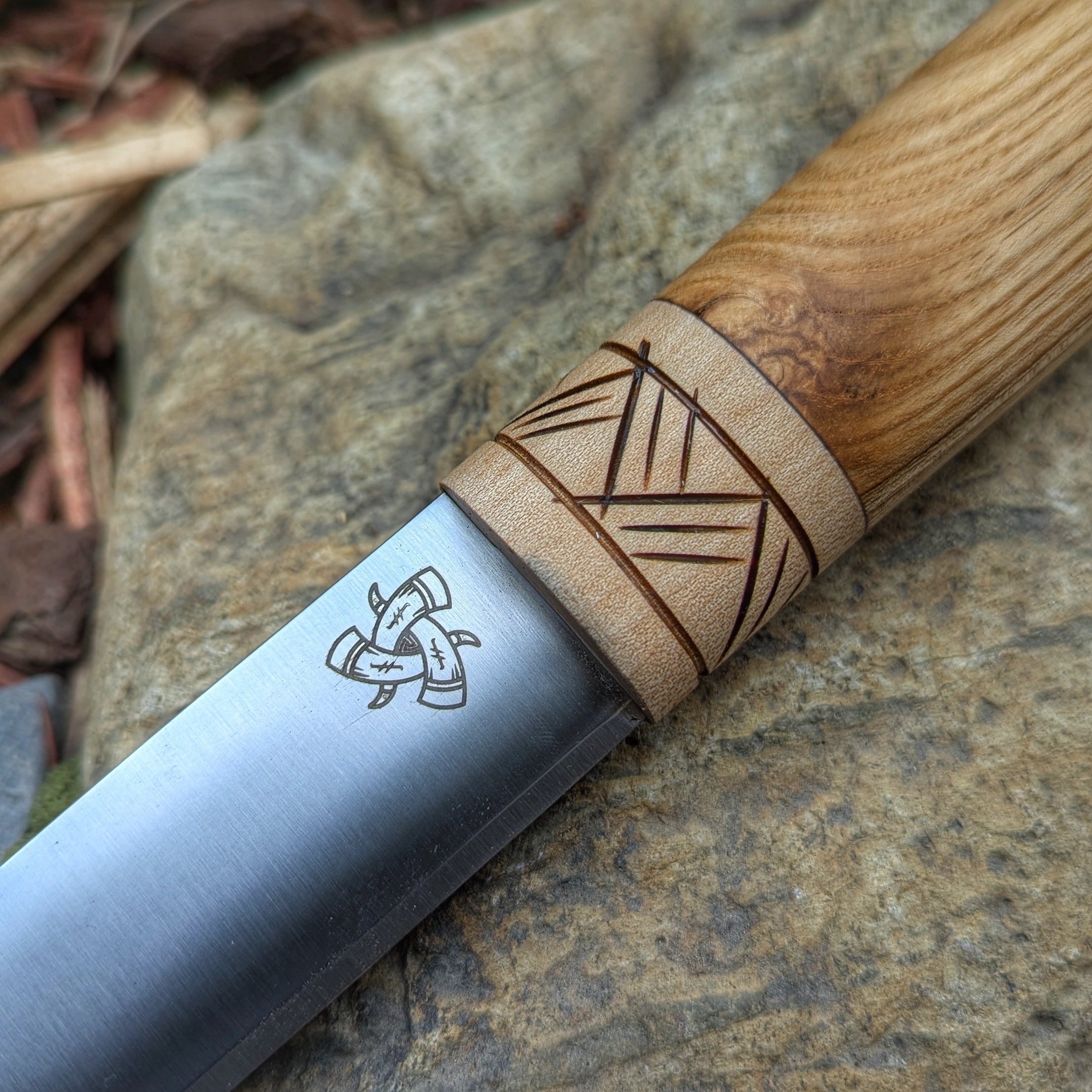 The leather sheath has been sewn and decorated by hand with - runic and brass accents - and houses the knife snugly.