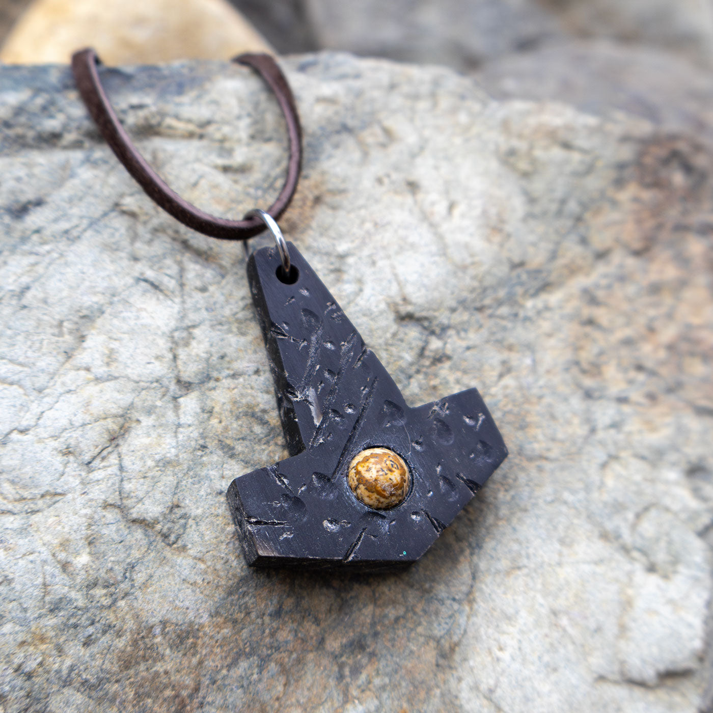 Mjölnir pendant that has been handcrafted out of Buffalo Horn. Not as highly polished as the others, it gives a more 'battle-worn' authentic finish and features a central gemstone.