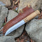 The leather sheath has been sewn and decorated by hand with - runic and brass accents - and houses the knife snugly.