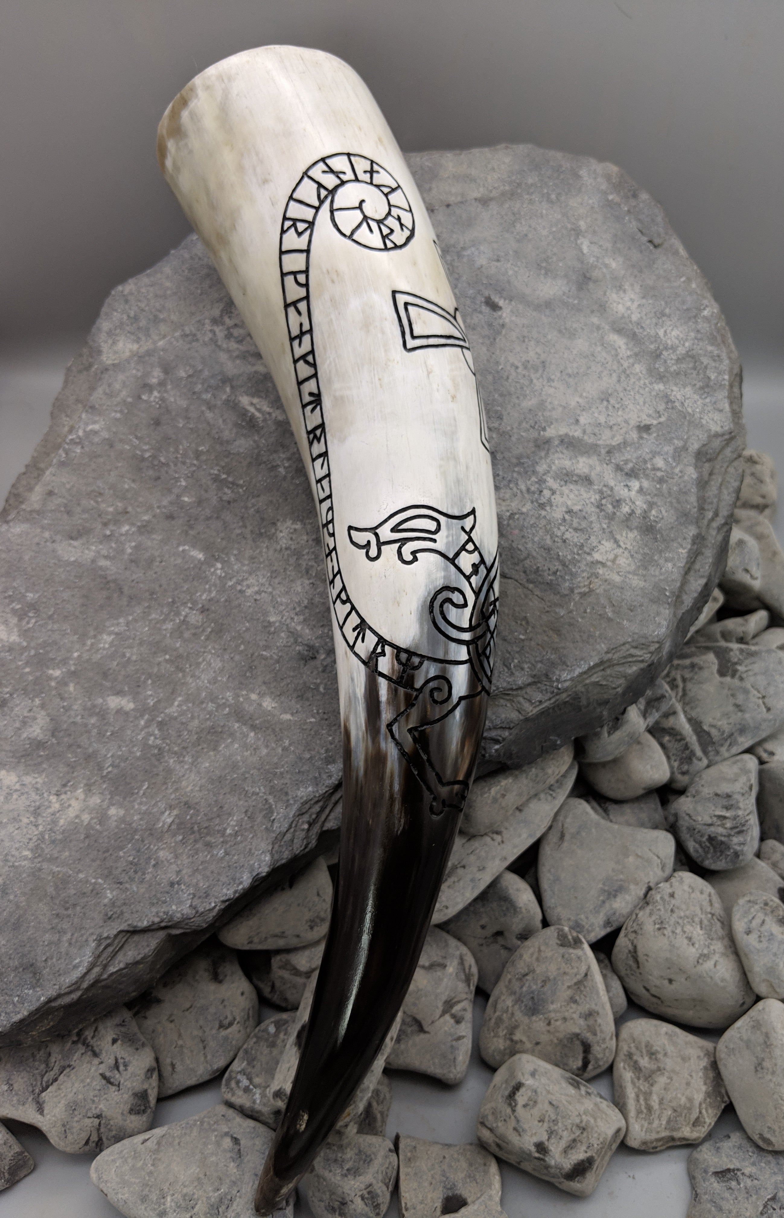 This horn has been hand carved to replicate the U240 Runestone located in Lingsberg, Sweden. The Runestone was originally created by a Wife and Son as a memorial to their Warrior Husband / Father; Halfdan.