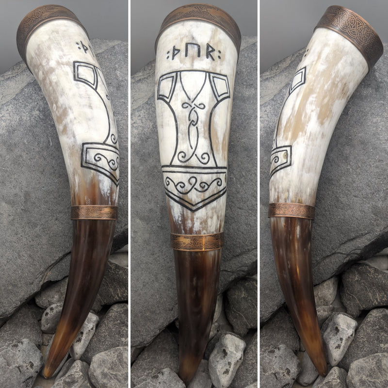 This horn has a pair of handmade copper rims that have been etched with a Hugin and Munin design. Mjolnir has been hand carved into the centre of the horn, with the runes Wunjo, Uruz and Thurs.