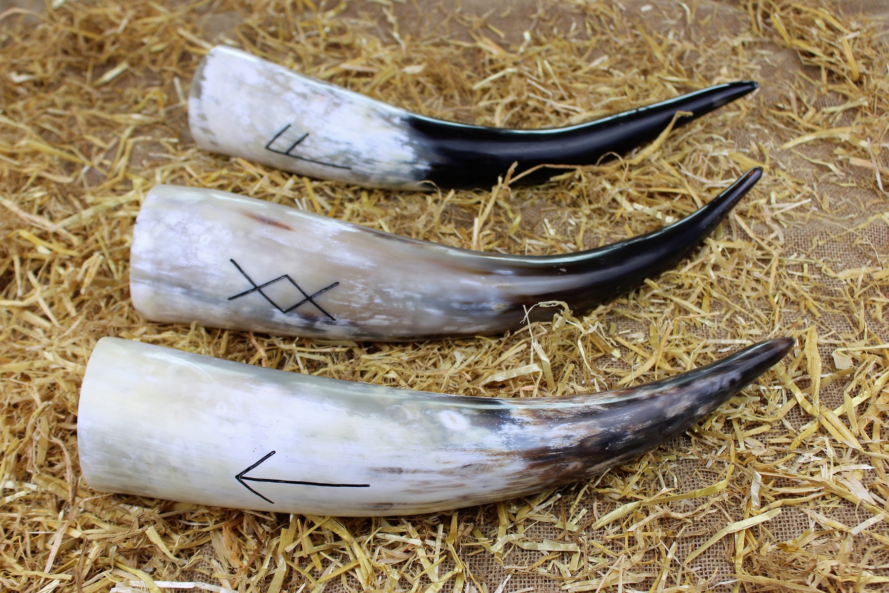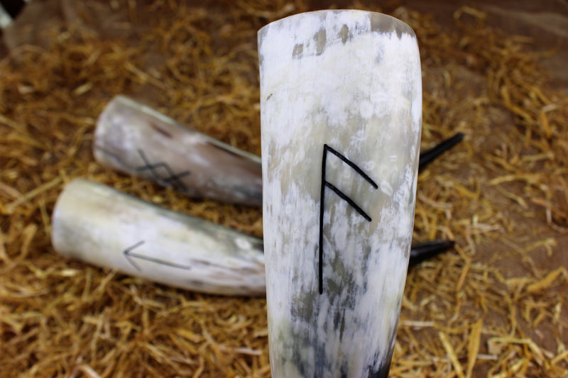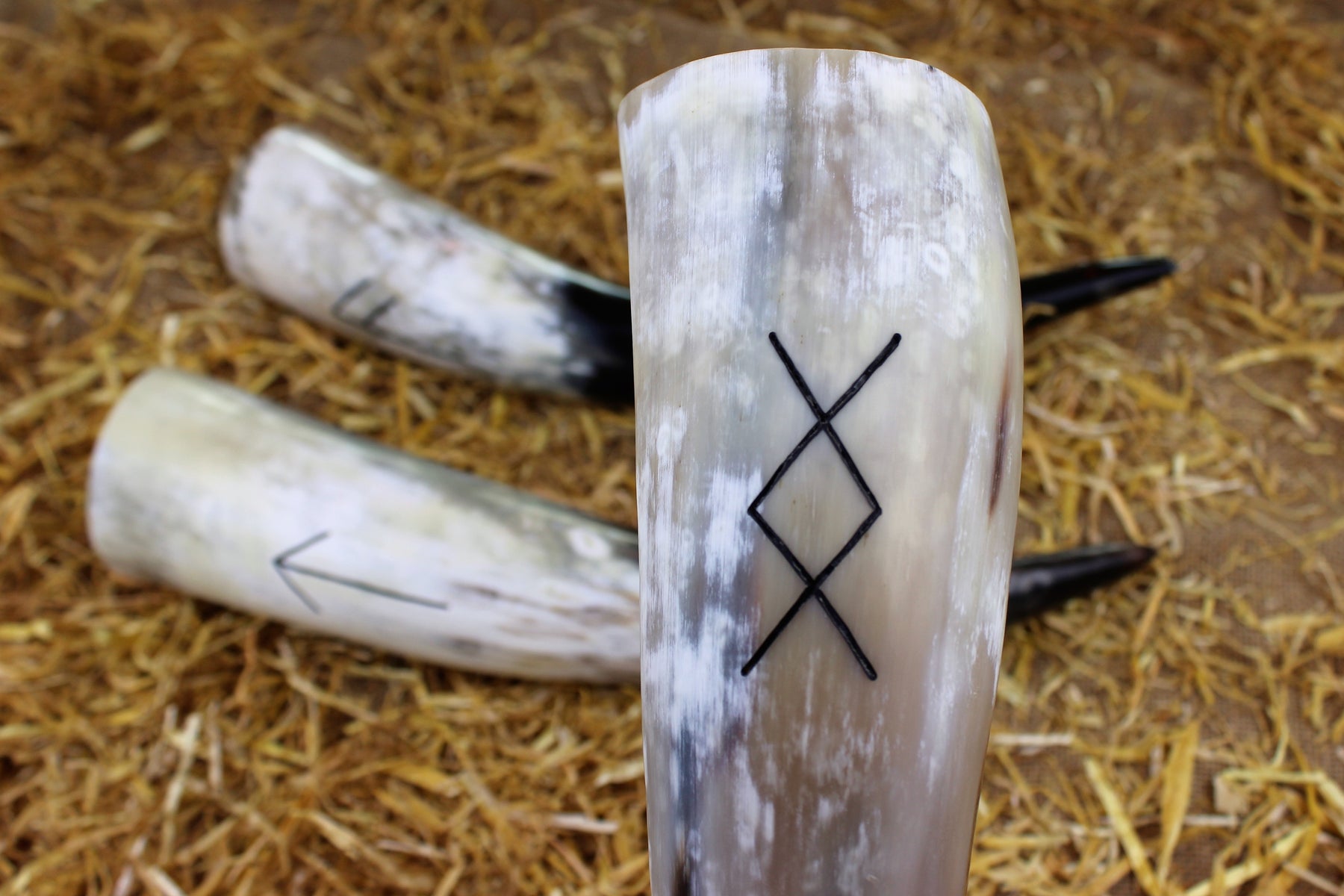 This horn is carved with a single Norse rune. Each rune has its own meaning, so please refer to our "Rune guide" sheet to order the one most suited to you.