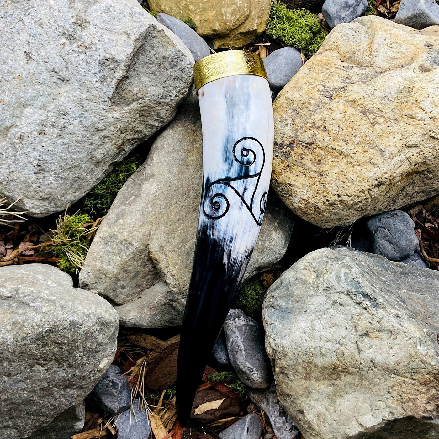 This horn has been hand carved with the Norse symbol, Triskelion.