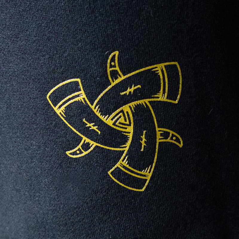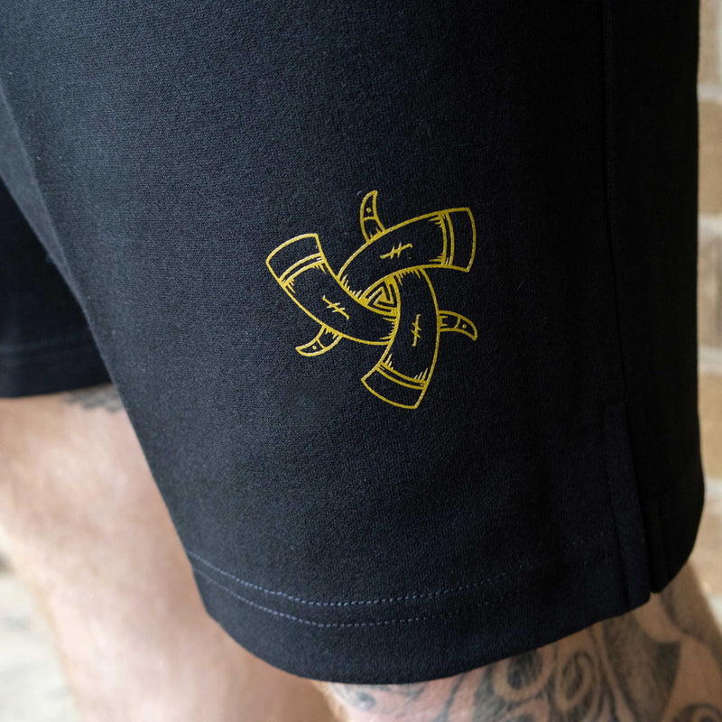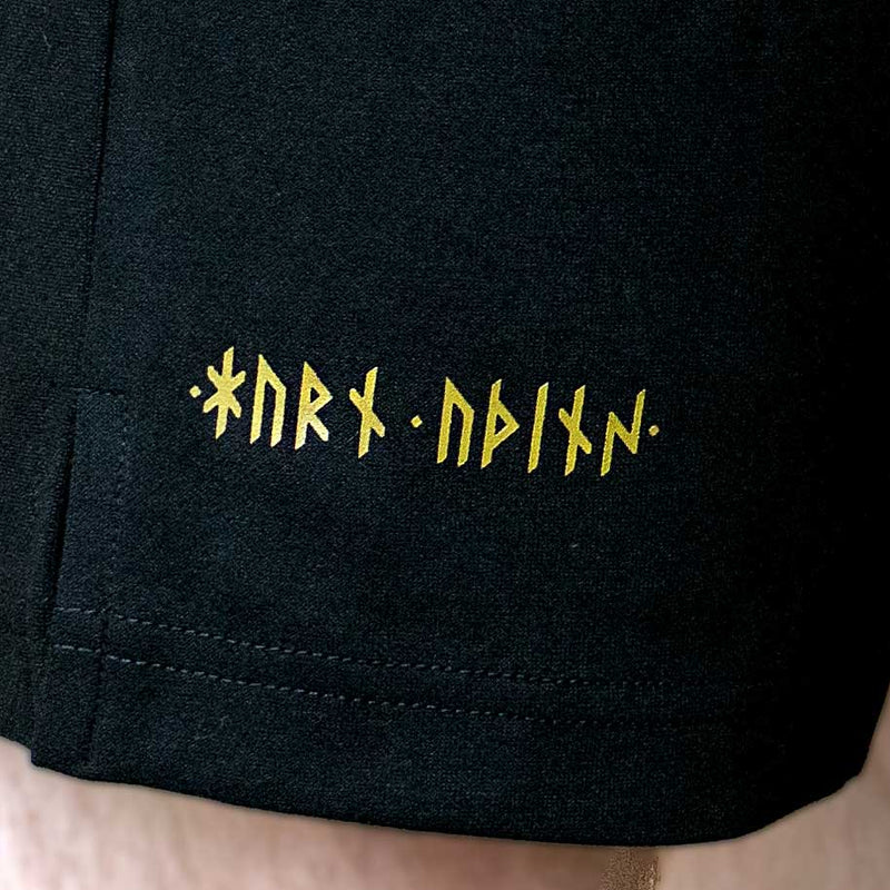 Our unique athletic shorts have been completely re-designed by us. Black with our iconic logo in gold on the hip as well as our name in runes in gold on the hem, they feature a rear zip pocket and two side pockets. Lightweight, quick-drying fabric makes them perfect for any type of physical activity.