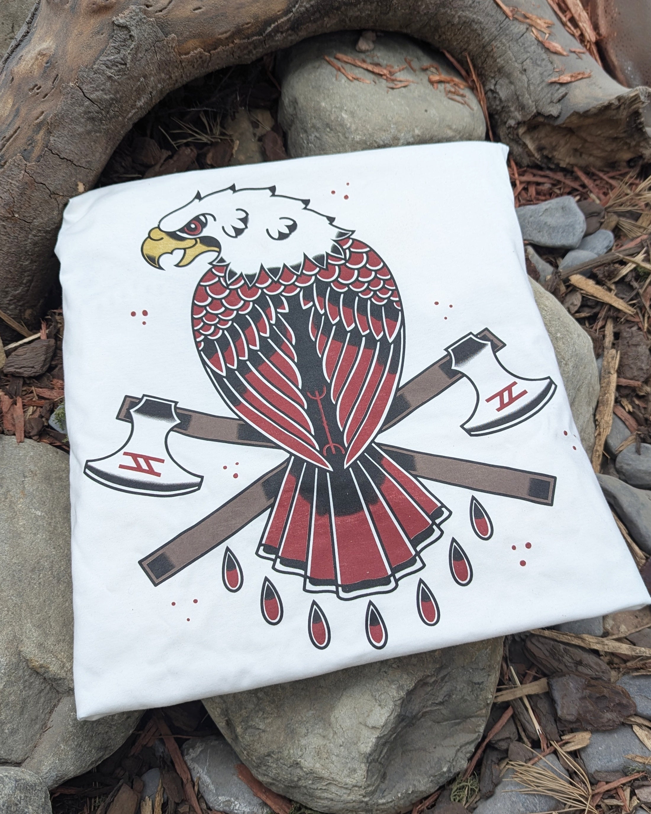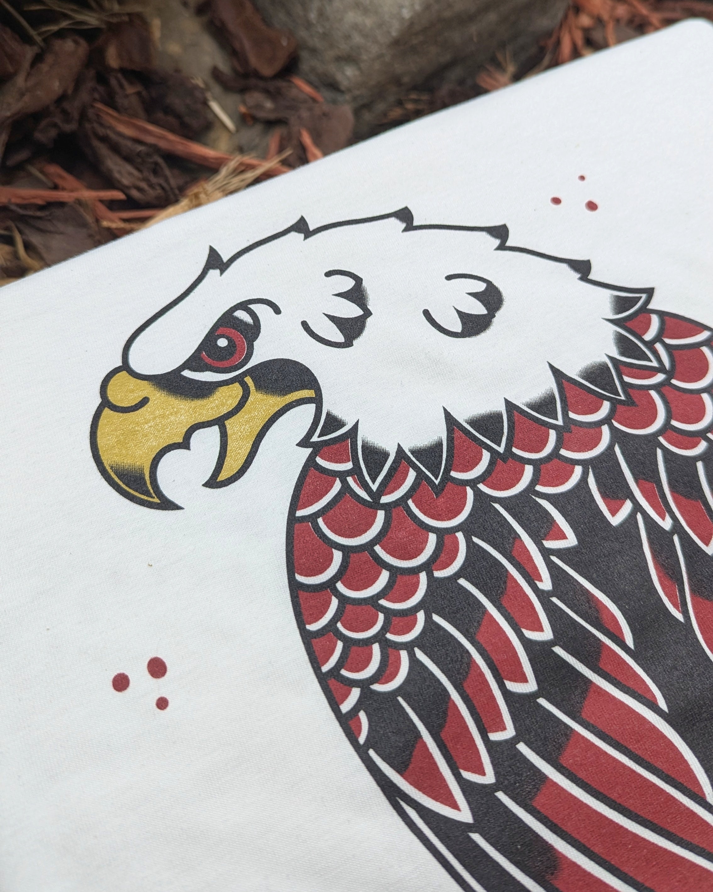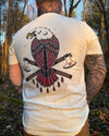 The Blood Eagle Tee in White is a medium fit men's t-shirt featuring high quality screen printed front and back designs inspired by traditional tattoo art styles. This premium mid-weight tee is made using 100% organic cotton, and sports a wider collar rib for that contemporary look.