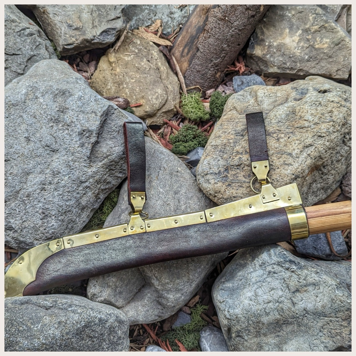 Each seax comes complete with a meticulously hand-sewn leather scabbard adorned with brass accents, showcasing masterful craftsmanship and attention to detail.