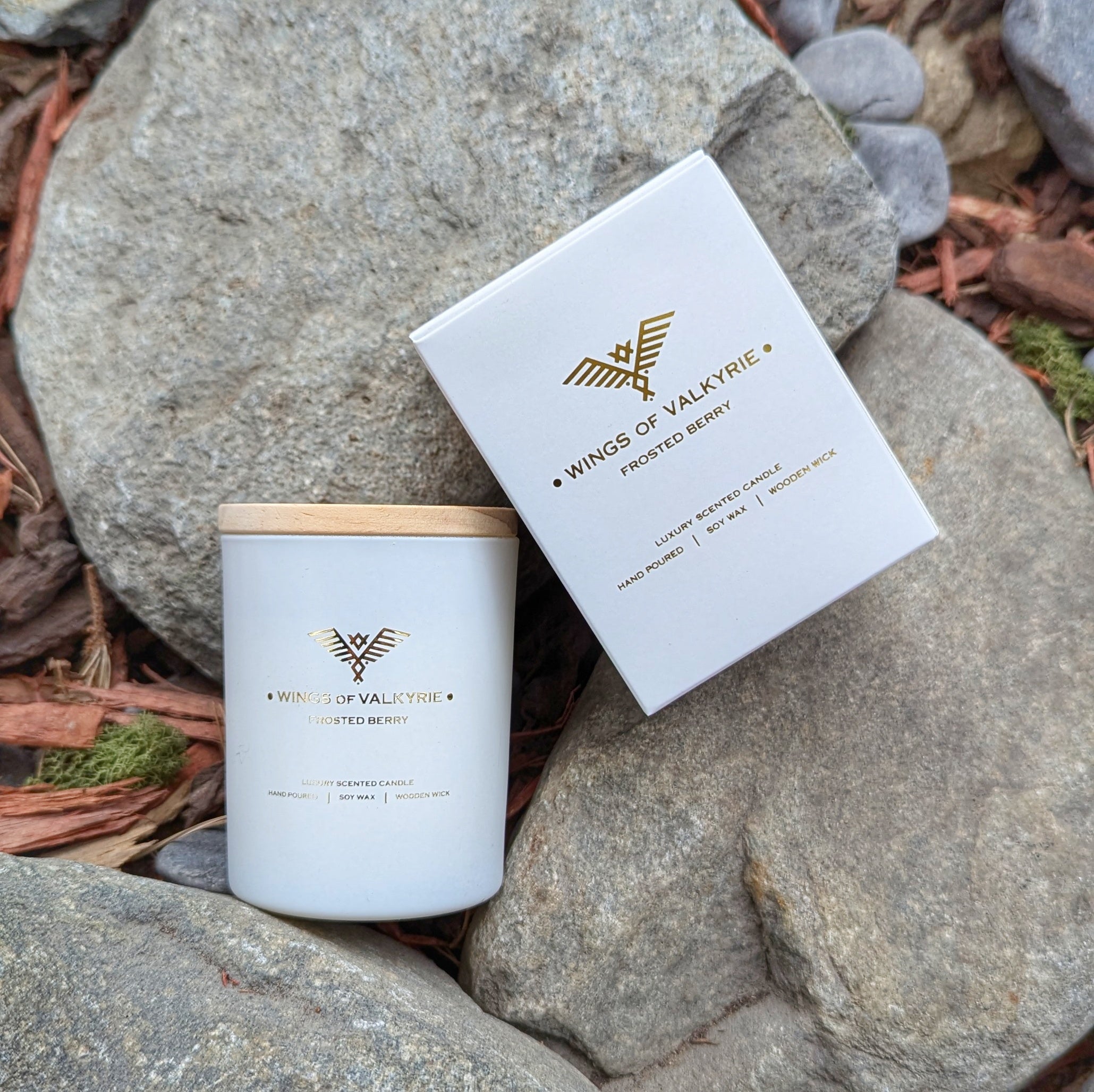 Ignite the spirit of a Viking warrior with our "Wings of Valkyrie" candle. Hand-poured with premium soy wax and imbued with a captivating blend of mystical frosted berries, this candle transports you to a realm of ancient belonging and ethereal beauty.